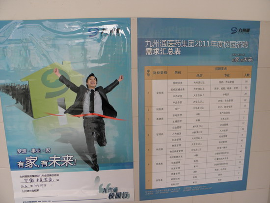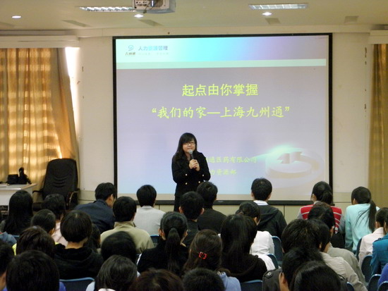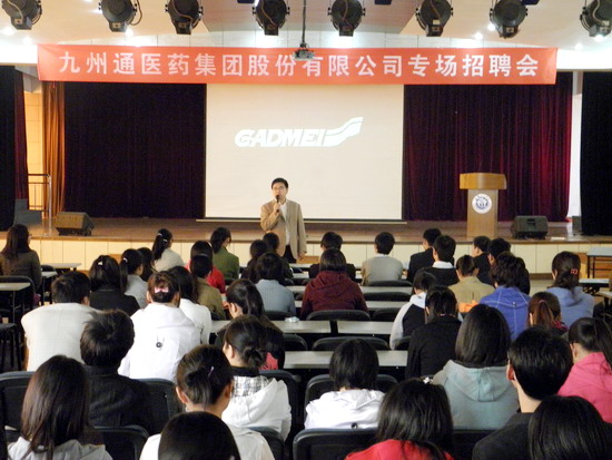 为促进员工就业,提高就业质量,扩大公司毕业生的就业影响力,2010年10月31日,由公司邀请的中国企业五百强,全国近万家医药商业企业中位列第三名、中国物流改革开放30年旗帜企业、九州通医药集团股份有限公司来到公司进行企业宣讲和招聘,本次招聘,该集团共带来了包括营销、管理、生产、技术等在内的共300余个工作岗位。