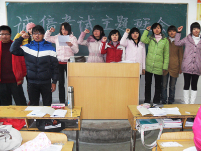 10级公共事业管理班于2010年12月28日下午在弘景楼304召开了以诚信考试为主题的班会。班会由班级团支书苏爱云主持,班级辅导员老师到会做考风考纪教育动员并鼓励同学们应提前准备积极应考。班级心理委员桑慧云带领大家重温安徽中医公司考场规则,班委集体带领大家宣誓表示对期末考试的信心以及对诚信考试的决心。