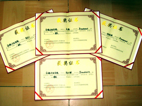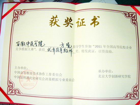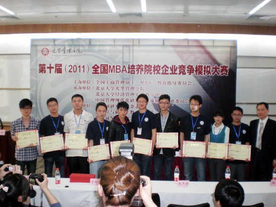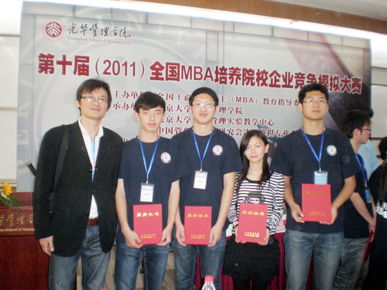 继公司在2009年获得全国MBA院校企业竞争模拟大赛三等奖后,2011年,公司代表队更上一层楼,再次获得佳绩。 5月,由中国高等教育技术协作工作委员会、中国管理现代化研究会决策模拟专业委员会主办,北京大学承办的全国高校企业竞争模拟大赛决赛在北京大学光华管理公司进行,本次决赛共有来自全国16所高校的21支队伍参加。由公司08贸易任少卿、09贸易李志广、方瑞、何雅玲等四位同学组成的安徽中医公司BRAVEHEART队通过努力拼搏,团结协作,以优异的成绩获得大赛一等奖。李珑等老师获得优秀指导教师称号。