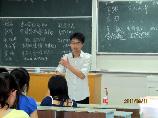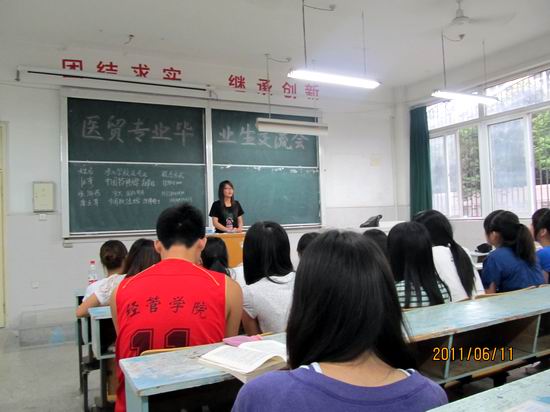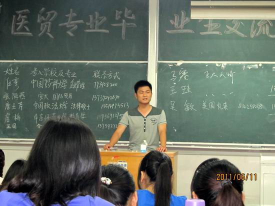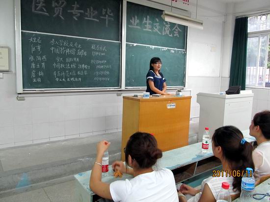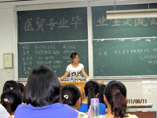 交流会现场,现在江苏康缘药业工作的2007级国贸班班长李旭耀主持了会议,考取安徽大学的张海燕、合肥工业大学的王园、中国药科大学的伍弯、华东师范大学的詹梅、中国政法大学的唐玉芹、就业于拜耳公司的李敏、美国礼来的吴敏、王琰、正大天晴药业的马赛等同学就自己考研、就业的经验、体会和在座的同学进行了充分的交流,同学们都认为在公司的努力学习可以帮助形成良好的学习习惯,积极的参加社会活动可以拓宽视野,增长见识,丰富自己的社会经验,对于以后的继续深造学习和就业起到了决定性的作用,也希望在座的学弟学妹们能珍惜在校的大好时光,积极努力,敢于创先,勇于争优,打造美丽精彩的大学人生。