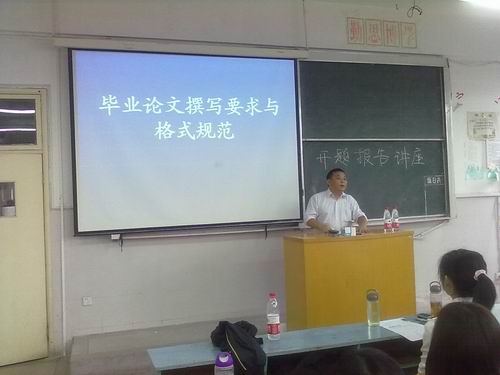 茆荣祥老师向同学们详细讲解了毕业论文从开始到结束的流程,并跟同学们探讨了一些细节问题,如在答辩时面对老师提出的问题同学们该如何应对。同时强调了论文格式的规范性,让同学们对毕业论文有了大致的了解。