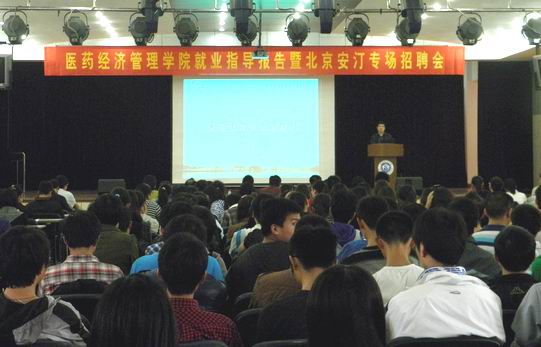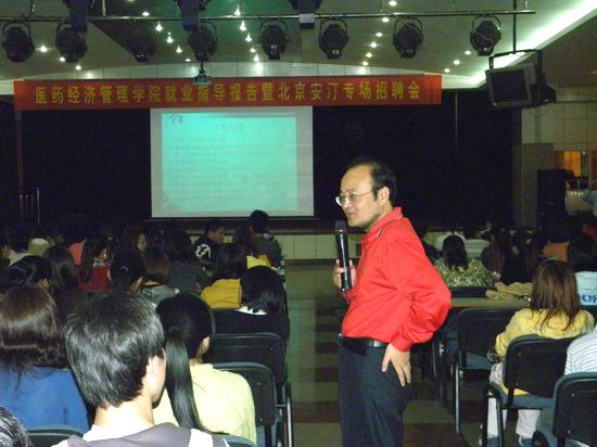 在随后进行的招聘会,由北京安汀医药生物科技有限公司程雪翔总经理亲自主持。程总对安汀药业的企业概况和文化做了详细介绍,并通过与同学们的互动,与同学们深入探讨什么是成功以及目标的重要性等问题,帮助同学们树立了正确的就业观和人生观。