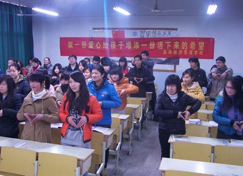 关爱小患者“张雪艳”,经管院举行“献一份爱心,给孩子增添一份活下来的希望”主题慈善捐款救助行动,今天上午在东区仲景楼达到了高潮。该院团总支组织东西两区千余名同学在课间同时开展现场爱心捐助活动,捐助款项总计达七千余元。