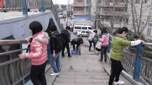 2012年3月9日下午,员工会办公室和生活实践部一起走上街头参加环卫义务劳动,用实际行动践行雷锋精神。大家相互配合,帮助利民站天桥的环卫人员擦栏杆。虽然天气很冷,同学们忙得热火朝天。栏杆“脱去”了污渍,路人和同学们脸上都浮现出满意的笑容。