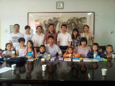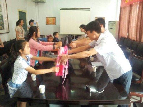 会上,毕业班的同学们向孩子们送上了精心准备的学习用品和些许资助款,并合影留念。