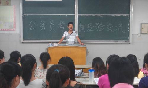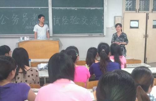 为了加强同学们对公务员考试的了解,学习面试技巧,增加录取获胜率。公司于2012年6月6日下午15:00在杏林楼102举办了公务员考试经验交流会。公司08级医贸班的夏敏同学以及辅导员洪世忠老师出席了本次经验交流会。