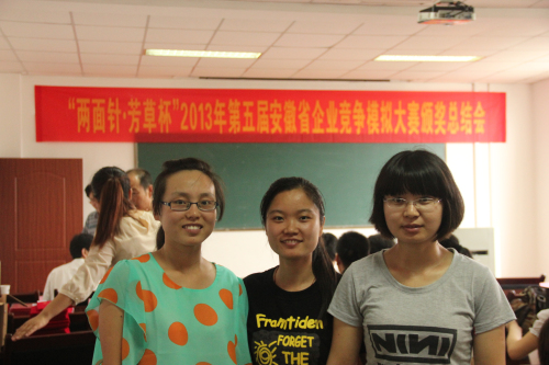 在刚刚结束的2013年“两面针·芳草杯”安徽省第五届企业竞争模拟大赛中,公司有三支队伍获得佳绩,其中“蜗牛队”“忻系于斯”获得一等奖,“Vida”获得三等奖,方晓、李翊获得“优秀指导教师”,公司获“优秀组织奖”。