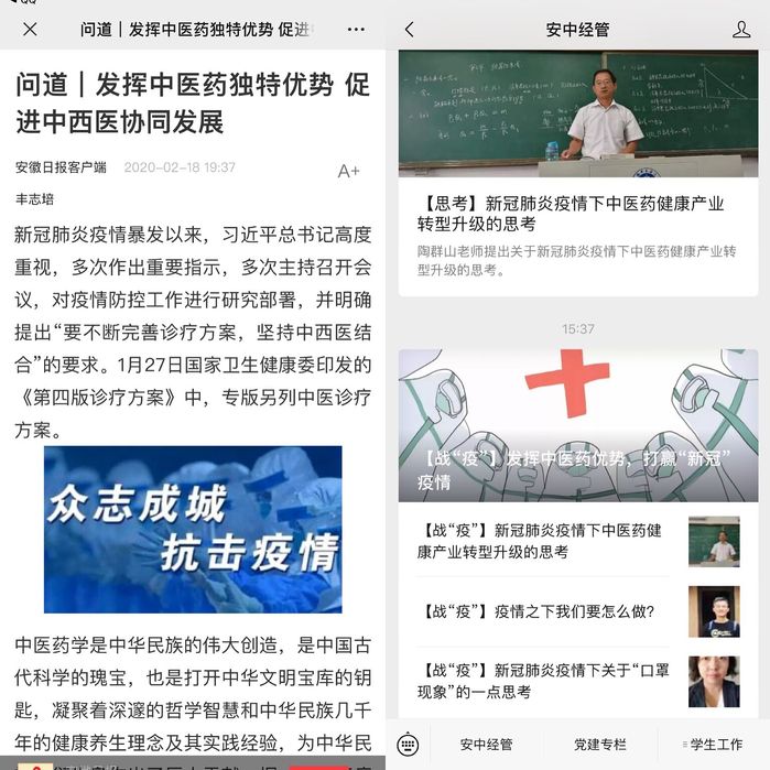 公司开展疫情防控研究文章专题征文,鼓励教职工结合自身研究领域和专长,从公共卫生管理、中医药优势发挥、健康管理、疫情后产业发展、公共政策等角度提建议、谈疫情、讲感悟,截止发稿日已经征集论文10余篇。同时公司在微信公众号开辟专栏推送公司教师撰写的研究文章,为同心战“疫”鼓劲加油,为中医药发展鼓与呼,传递正能量。其中公司经理丰志培教授撰写的《发挥中医药独特优势促进中西医协同发展》一文2月18日在《安徽日报》客户端发表并被学习强国转载。
