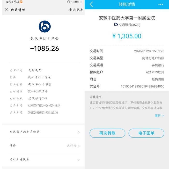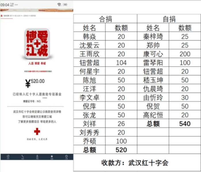 除此之外,同学们也通过不同渠道进行捐款。2019级国际经济与贸易专业向公司一附院、武汉慈善总会、武汉红十字会等捐款合计2571元;2019级公共事业管理专业爱心捐款1085.26元;2019级保险专业向武汉红十字会爱心捐款1060元。