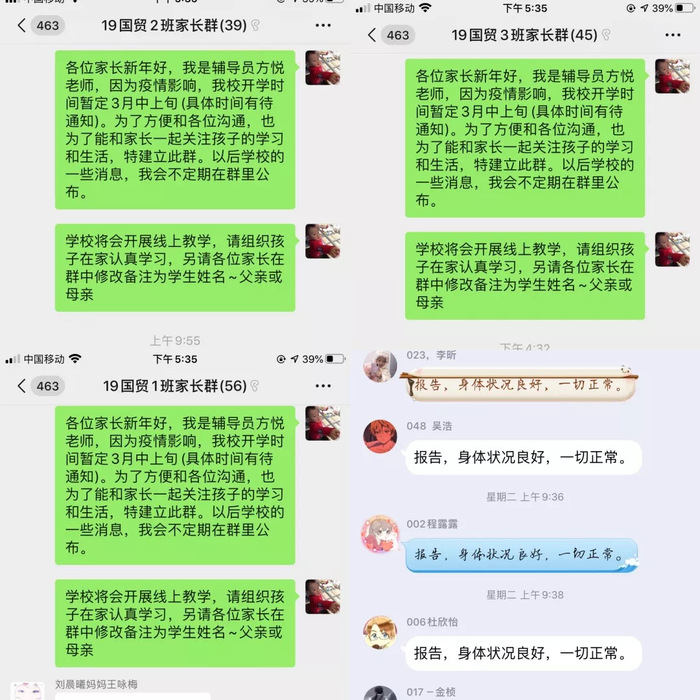 面对突如其来的肺炎疫情,辅导员们除了关注疫情的发展还要关注员工的身心状态。大家按照公司的要求,通过QQ群、家长微信群了解员工的健康状况和思想动态,做好情况统计,并叮嘱员工在家做好防护,在家坚持学习,用自己所学的知识向身边亲友宣教防疫知识。辅导员方悦说:“面对疫情,作为一名辅导员和思政教育工作者,我一直在思考如何利用这些鲜活的抗疫战士的故事给广大同学们上好一堂生动的思政教育课。”
