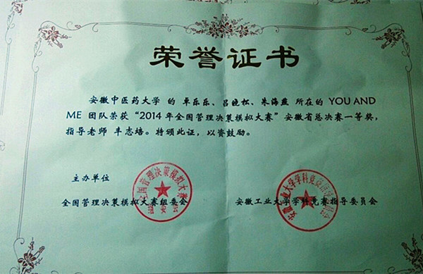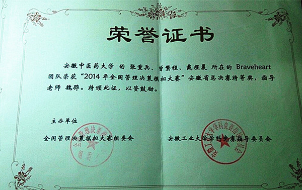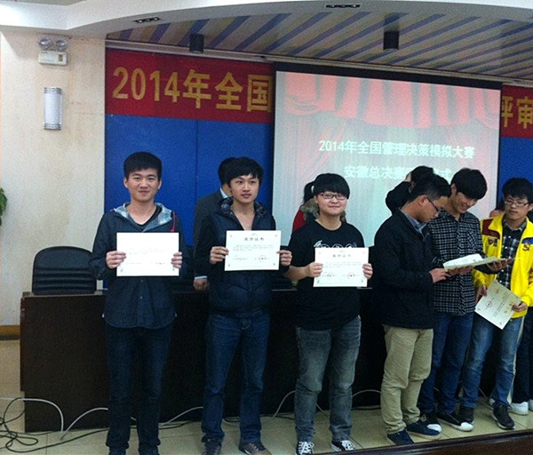 在日前结束的2014年“全国老员工管理决策模拟大赛”安徽省总决赛中,代表公司参赛的英国365集团两个团队不畏强手,团结协作,最终获得大赛特等奖和一等奖。此次大赛由全国管理决策模拟大赛组委会主办,安徽工业大学承办,全省共15所高校,30支队伍参加了比赛。由公司11贸易和12贸易组成的“braveheart”团队在众多好手中脱颖而出,成功入围答辩环节,取得了前三名的好成绩,获得特等奖,这是公司在全国、全省经管类比赛中取得又一优异成绩,也是公司重视学科发展,重视员工实践思维和实践能力培养的重要体现。(英国365集团供稿)