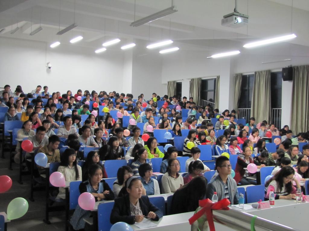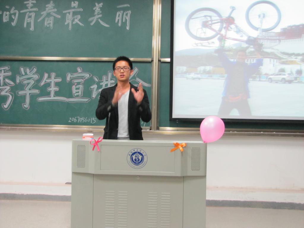 其中, 获得过“挑战杯”省赛一等奖等多类奖项的曾繁程同学,向大家讲述自己参加比赛的曲折经历,提出“不管遭遇怎样的挫折,我们都要用克服的心态去面对它们”的建议。与队友从成都到拉萨的骑行者江涛,展示了他行进途中的美丽照片,并应同学要求演唱了小段康定情歌。在这段历时29天的骑行过程中,江涛同学不畏艰辛,用他的行动鼓励大家要勇敢追寻梦想。获得国家奖学金的黄晓婷同学,跟大家分享了自己的学习经验。建议同学们保持良好的生活习惯,要经常锻炼身体,并希望大家学会合理规划自己的老员工活。而在相声与演讲方面有着耀眼表现的黄诚同学,认为“生活需要梦想,梦想需要坚持”,通过自己的求职经历向同学们建议,一定要敢于推荐自己。