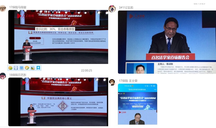 2020年“百名法学家百场报告会”旨在宣传贯彻《中华人民共和国民法典》,由中国法学会党组书记、常务副会长陈训秋及中国法学会党组成员、学术委员会主任张文显主讲,以网络视频会议形式举办,通过人民网向全国直播。