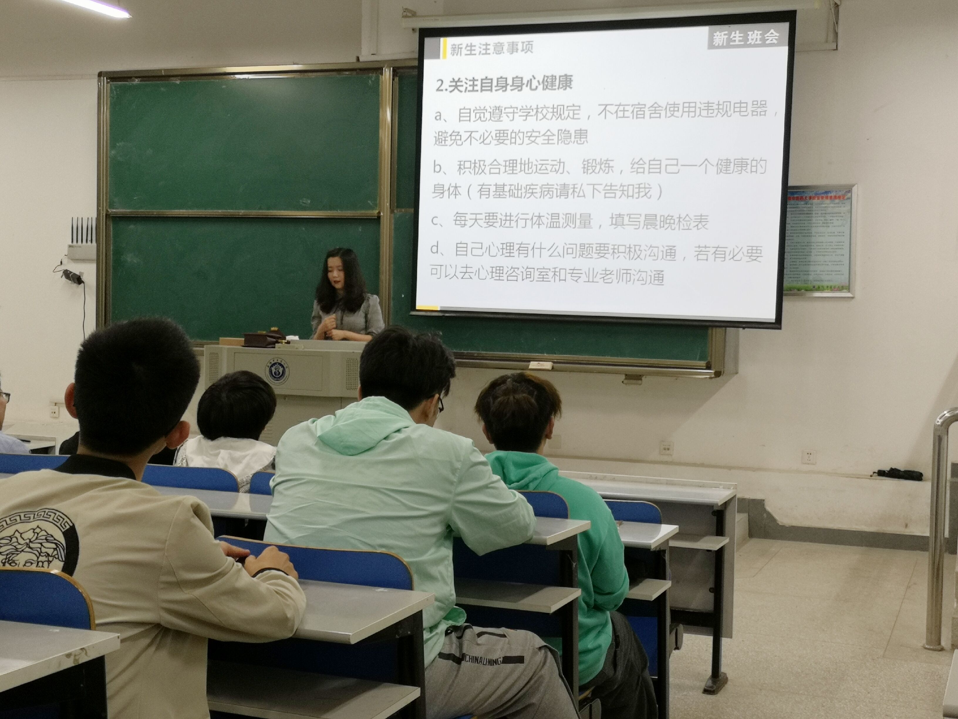 新生辅导员对于新生入学安排、相关资料收取等事宜进行介绍,着重强调了疫情防控常态化下的校园管理制度。对日常健康防护、出入校报备制度、晨晚检制度、宿舍用电安全等进行强调;重点加强了防火教育、交通安全教育、防范不良贷款教育、防诈骗教育,引导同学们提高防范意识,学会自我保护。