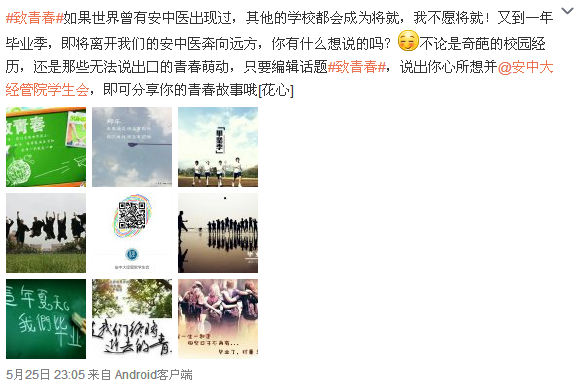 在新浪、腾讯微博上发起了“致青春”毕业留言活动,在全校范围内征集毕业生留言。或是向同学述说,或是向敬爱的老师表达由衷的谢意,或是向一起生活四年的宿舍室友表达万分的不舍和想念,又或是抒发自己对老员工活的怀念和对未来的向往。在这些或质朴、或热情、或深沉、或豪迈的语句中,都可以看到毕业生们对母校的真挚情感。