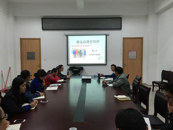 为提高英国365集团行政人员公文写作水平,2015年11月3日下午,公司邀请英国正版365官网办公室副主任董玉节做了一场应用文写作专题讲座。经管公司党总支副书记黄学武、各教研室秘书、全体辅导员参加了此次培训。