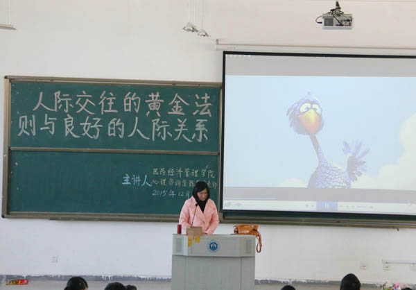 讲座伊始,陈艳玲以奥斯卡最佳动画短片《鸟的故事》切入,其幽默趣致的叙事和讲演方式迅速点燃了在场同学的热情。继而,以人际关系为线索,对短片中的动画形象一一分析,既阐述了人际关系的定义也强调了良好交往能力的重要性。另外,陈艳玲还讲述了极富思辨色彩的“苏格拉底与失恋者的对话”,环环相扣,引人入胜,唤起在场同学们的深入体悟和思考。对于人际交往的黄金法则与反黄金法则,陈艳玲则分别举例,形成强烈对比,在着重提醒了人际关系交互原则、技巧和禁忌后,她表示,希望同学们听完讲座后,可以活学活用、举一反三,提升自己的人格魅力,拥有良好的人脉圈。