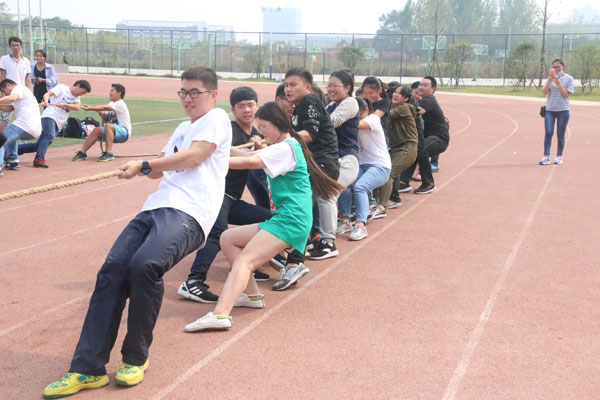 大一大二各班级组建代表队,共有15支队伍参加比赛。比赛分为5个项目,分别为拔河、螃蟹夹球、跳长绳、吃货大比拼。各班运动员代表同心协力,配合默契一次次爆发潜力突破极限。赛场上,呐喊声传递出无穷的力量,欢笑声谱写出青春的歌曲。经过一轮轮精彩而激烈的角逐,15营销班荣获一等奖,15贸一、16贸二获得二等奖,15保险、15人管、15心理获得三等奖。