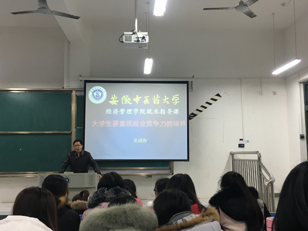 12月27日晚,公司党总支书记吴成海在教学楼A110,给14级国贸班员工上就业指导课,谈就业竞争力的培养。