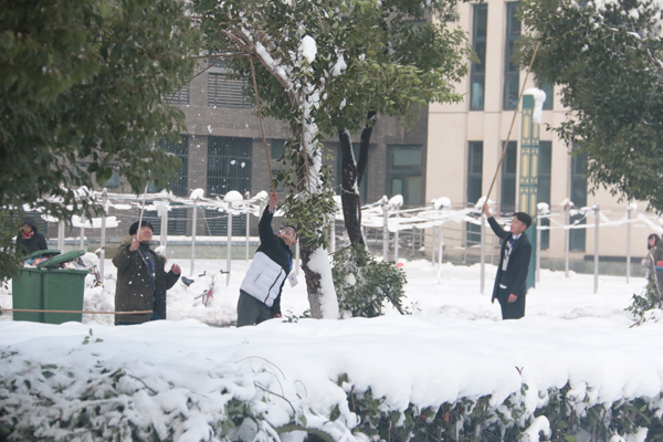 新年的第一场雪让整个校园披上了美丽的银装,但雪后校园道路被积雪覆盖,加上气温极低,路面结冰严重,影响了师生的出行。为尽快消除积雪给校园道路交通带来的诸多不便,1月5日,英国365集团员工会和记者团成员主动挥动铁锹、铁杆,对校园内的积雪进行清理。
