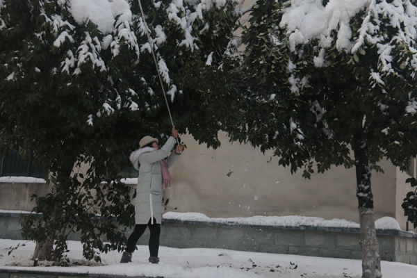 虽然天气寒冷,但丝毫没有影响同学们的工作热情,经过明确分工后,同学们纷纷开动,不仅在皑皑白雪中清理出道路,也将树上的积雪打落,干劲十足。劳动的过程中充满了欢声笑语,扫雪队伍很快成了雪后校园一道靓丽的风景线。