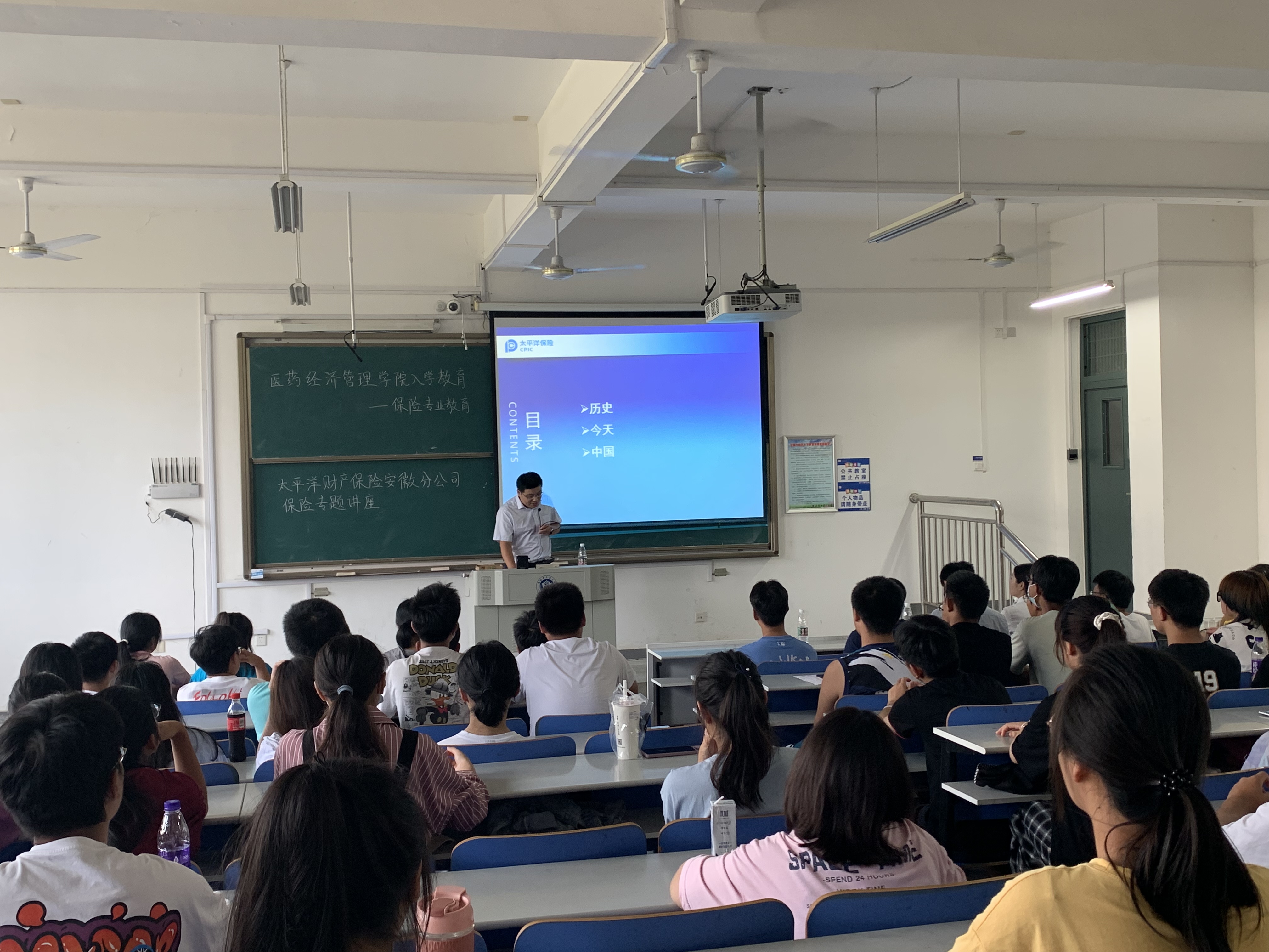 本次讲座由中国太保产险安徽分公司纪委书记、总经理助理张岳主讲,安徽分公司车意险理赔部高级经理丁亚夫,公司员工、安徽分公司人伤管理科科长李乐意,公司员工合肥中心支公司人伤诉讼科科员张亚如以及全体2021级保险新生参加了讲座。