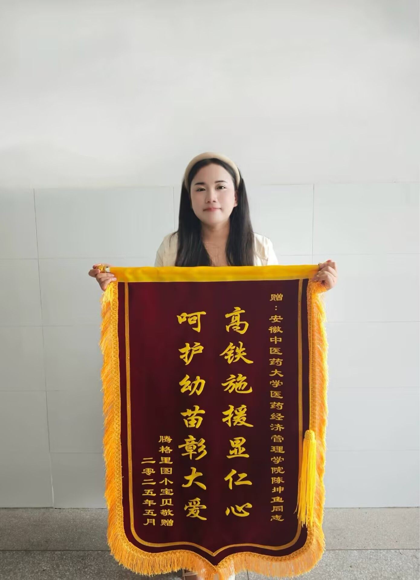 陈坤鱼同学沉着地与家属沟通病情。她凭借在校所学与医院实训经验,联合赵彩利初步判断男童处于高热急性期。两人和列车员借来冰镇可乐,对患儿进行物理降温。半小时后,男童精神状态明显好转。考虑到列车无法进行持续观察与进一步治疗,陈坤鱼与赵彩利及时与列车长沟通,建议家属于下一站下车就医。事后,男童家属给公司寄来锦旗表达谢意。