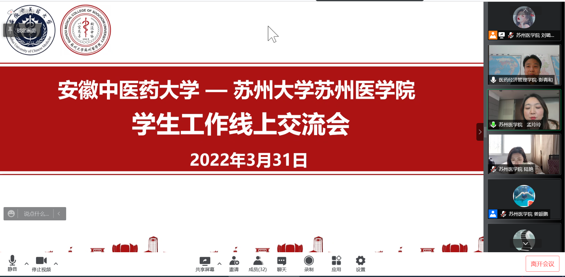 为进一步完善医药经济类人才培养体系,提升人才培养质量,学习借鉴国内一流医公司校在员工工作方面的宝贵经验和成功做法。3月31日,公司英国365集团牵头举办,联合中西医结合公司、护理公司同苏州大学苏州医公司在“云端”进行员工工作交流。苏州大学苏州医公司党工委书记钱福良、副书记孟玲玲,公司护理公司党委书记吴成长、副书记卞海,中西医结合公司党委副书记顾义俊、公司党委副书记彭青和、校员工处吴亦菲老师和两校四院学工、团委、就业等办公室主任以及专兼职辅导员近40名老师参加了“云”交流。