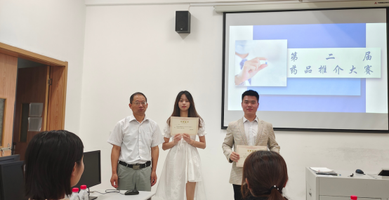 在比赛过程中,各参赛团队围绕着自己推荐药品的市场优势、销售对象、以及临床应用等方面进行展示推介。评委老师对同学们的表现给与了高度评价和宝贵意见,倪飞老师提到选手在展示自己的PPT时要声音洪亮,做到脱稿,注意自己的仪态,而在介绍药品的时候要更加突出药品的使用对象等关键性问题,为各小组选手提出了改进的方向。