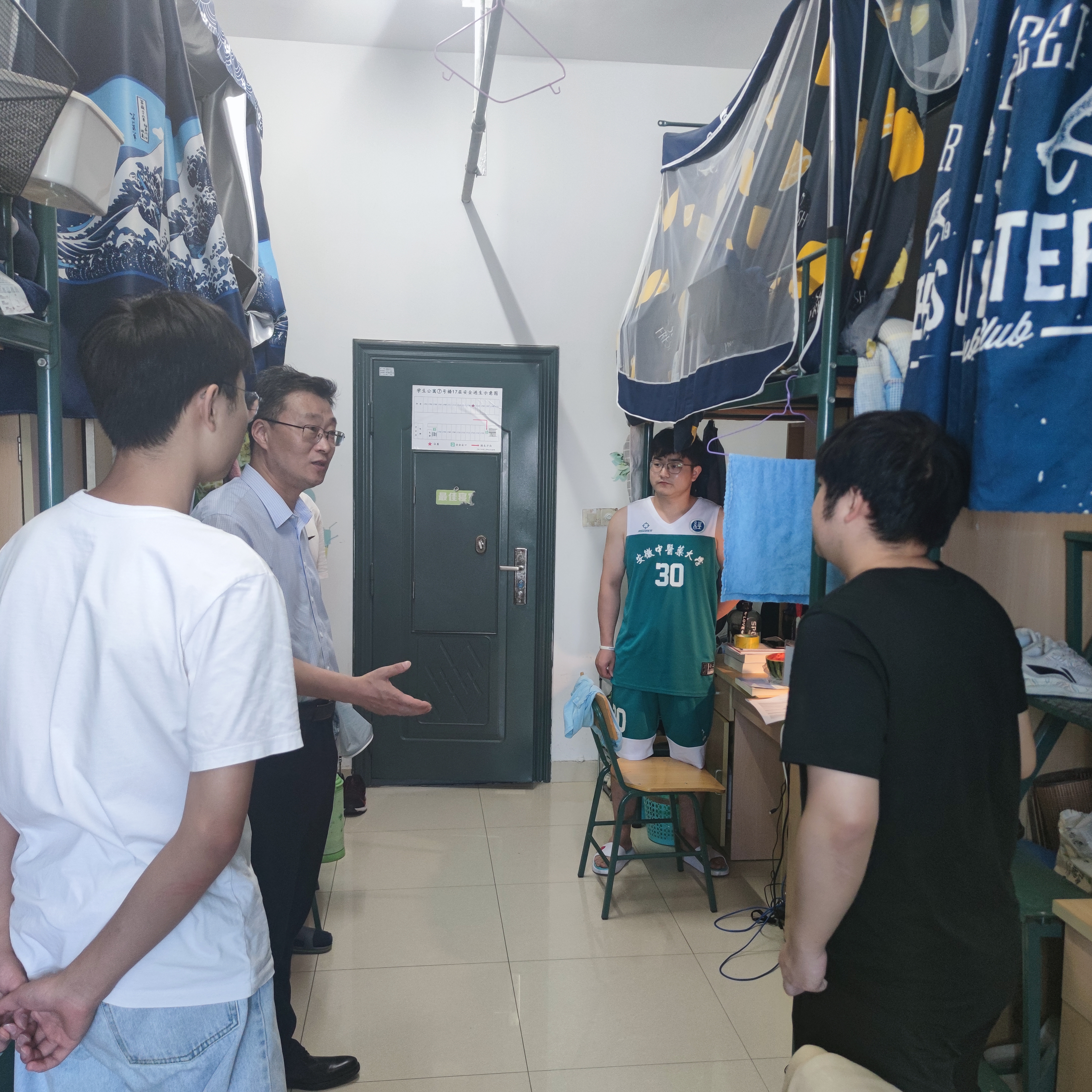公司领导在辅导员的陪同下深入员工宿舍,走访过程中,公司领导首先对同学们致以端午佳节的节日问候,对员工宿舍的用水用电以及防火防盗情况进行了解,排查总体结果良好。公司领导在走访中一致强调,一是要紧绷疫情防控这根弦,遵守校园疫情防控的相关规定;二是要注意假期宿舍的用电用水安全,不得使用明火、违规电器等;三是注意保护好个人财产,出门记得锁门,同时谨防电信诈骗,提高个人风险防范意识;四是期末考试和四六级考试临近,要抓紧时间复习备考等。同学们纷纷点头,感谢领导、老师们的问候、提醒。
