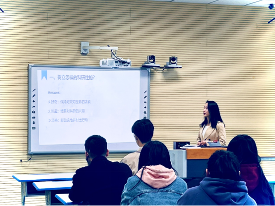 赵梦婵老师结合自身实践和研究成果与同学们进行科研经验分享,从保持好奇、热爱、坚持的科研性格到培养良好科研习惯,以生动的研究案例阐述了科学问题的选择、科研能力的提升以及科研心态的培养,希望同学们能够保持对未知世界的求索,脚踏实地付出行动,进一步探索更多有价值的学术课题。