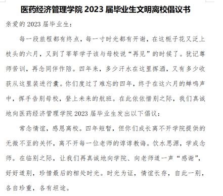 毕业生文明离校教育是大学思想政治教育工作的重要环节,是落实立德树人根本任务的重要措施,是公司精神文明建设的重要内容,是公司“振兴中医药,建设双一流”的重要体现。为切实做好2023届毕业生文明离校教育工作,医药经济公司党委高度重视,精心组织安排,通过系列活动的有序开展,教育引导2023届毕业生坚定理想信念,厚植家国情怀,让毕业生离校成为实现梦想、报效祖国的起点,让青春在强国复兴征程中远航。(孙建华/文图 冯鑫/审核)