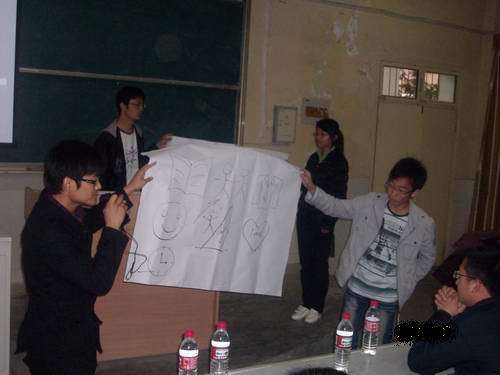 三位同学从各自不同的从业经验以及工作以及工作经历介绍现在医药销售行业的现状,发展的前景,以及目前需要在校内储备的知识技能等等方面。中间进行了小游戏的互动,康缘经管班的同学分组用图片的形式展示了自己心目中的医药代表所需要具备的才能。