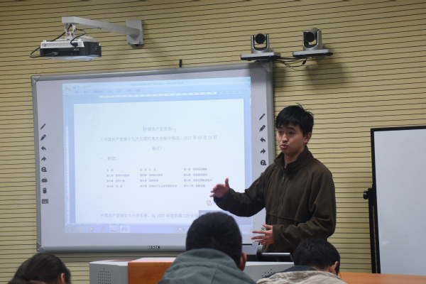 沈晨带领学员们进行《中国共产党章程》导读学习。他首先带领学员们回顾了中国共产党的诞生,随后,从历史发展的时间线,从第一次人民代表大会到十九大,深入介绍了党章的历次修改,以及动荡年代修改党章的不易。最后,他强调了党员权利与义务,并教导学员们坚持群众路线,要跟随党的领导思想,争取成为合格的党员。