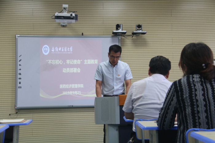 会议上首先由沈少蕾对“不忘初心、牢记使命”主题教育作介绍,沈少蕾传达领学了习近平总书记在“不忘初心、牢记使命”主题教育工作会议上的重要讲话精神。沈少蕾指出,习近平总书记重要讲话精神,是开展主题教育的根本指针,是新时代加强党的建设的纲领性文献。要坚决把思想和行动统一到习近平总书记重要讲话精神上来。院领导班子和党员要先学起来,先做起来,先改起来,把各项要求不折不扣落实到位,为全院开展主题教育作出表率,发挥引领示范作用。随后由校第四巡回组组长蒋宏杰作动员部署,他强调了主题教育的七方面内容,并提出了四项措施和五点要求,要求把“不忘初心、牢记使命”精神落到实处,深化思想认识,聚集主题主线,做好“四个结合”,坚持问题导向,发挥原始作风,他希望院领导和各位党员教师能认真完成第四巡导组的各项要求。