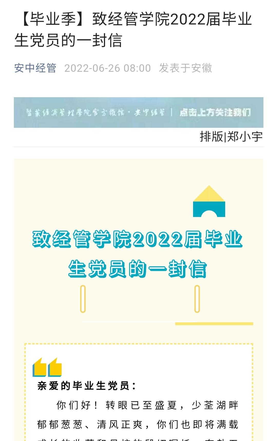 为了体现公司对毕业生党员的关怀和期许,加强毕业生党员对母校的情怀以及对自身肩负使命的认识。在毕业生离校之际,公司党委发出了致毕业生党员的一封信活动。这封信从雷动胸中万卷书、共铸辉煌中国梦;至精至诚严修身、惟是惟新守原则;爱岗敬业甘奉献、艰苦奋斗勇担当;文明离校树榜样、心怀珍重赴远方四个方面对毕业生提出了殷切嘱托。