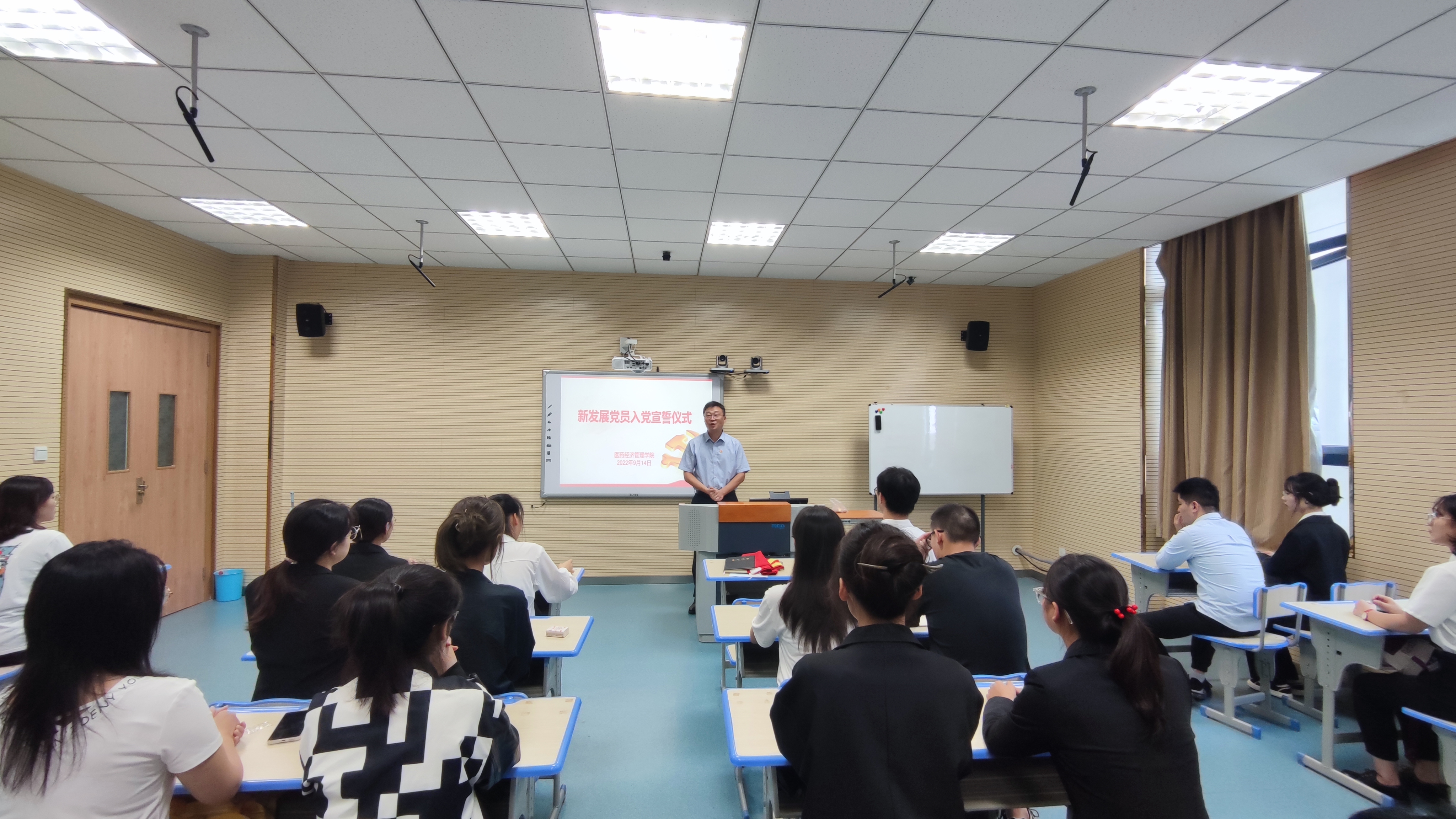 宣誓环节结束后,冯鑫面向所有新发展党员表示欢迎并强调,大家的称呼变化实质上是身份和责任的变化,同志们不仅要在形式上入党,更重要的是在思想和行动上入党。他对新发展党员提出四点要求:一是坚定理想信念,将忠诚融入血液。忠诚是共产党人的第一位的政治品格,是我们党与生俱来的红色基因,是党员不可缺少的政治灵魂;二是强化理论武装,增强理论自觉。理论上清醒,政治上才能坚定,行动上才能自觉;三是树立宗旨意识,全心全意为人民服务,吃苦在前,享受在后;四是发挥模范作用,当好同学的“领头雁”。最后他希望新党员们能做好学业上、遵守行为规范、为他人服务三个方面的表率,努力提升自己,积极为就业做好准备,以更加昂扬的姿态、饱满的热情和优异的成绩迎接党的二十大胜利召开。