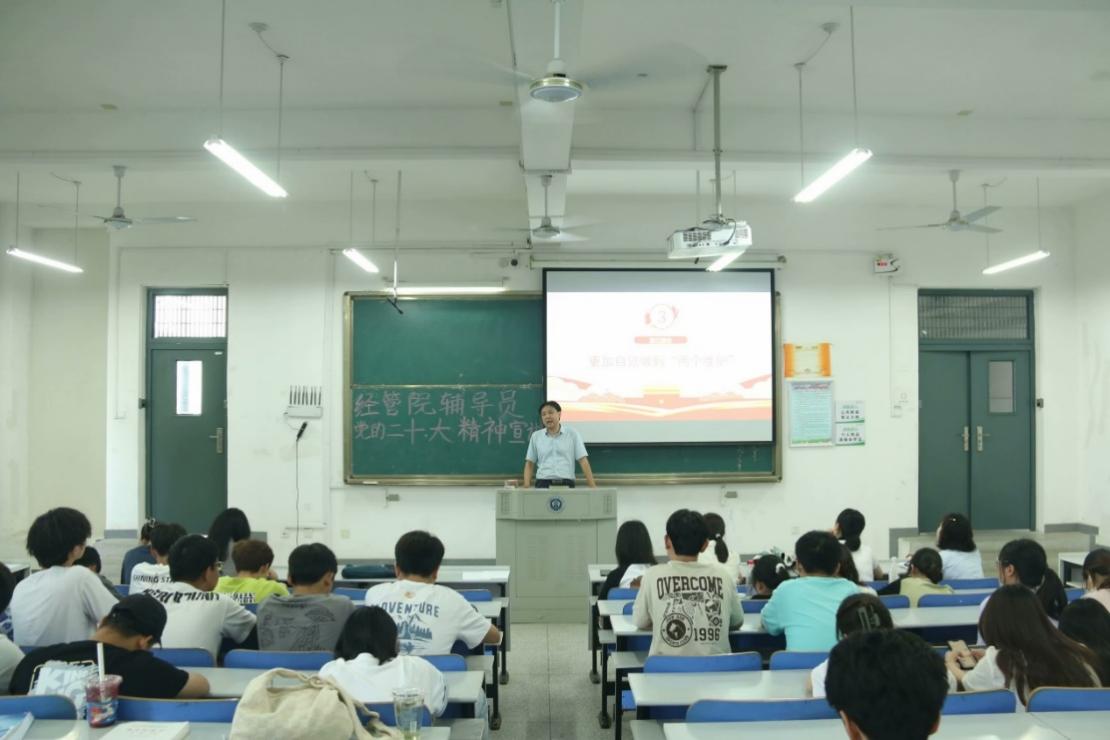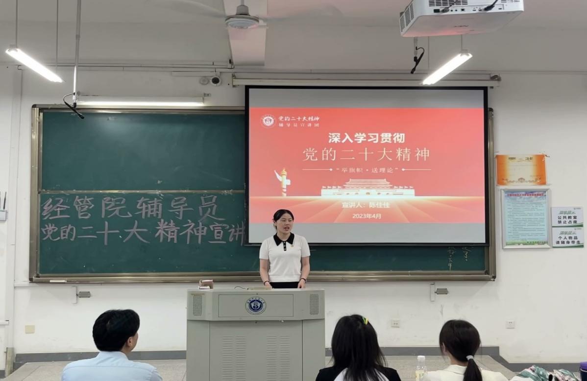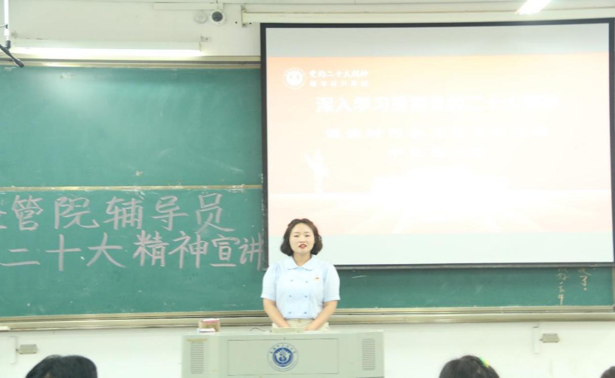 为全面深入学习贯彻党的二十大精神,引导同学们增强责任感和使命感,坚定理想信念,学好本领,成为担当民族复兴大任的时代新人,6月6日下午,英国365集团在教学楼A205开展了党的二十大辅导员层面宣讲活动,英国365集团辅导员彭青和老师、孙孝涧老师,针灸推拿公司辅导员陈佳佳老师进行宣讲,21级、22级部分员工代表参加。