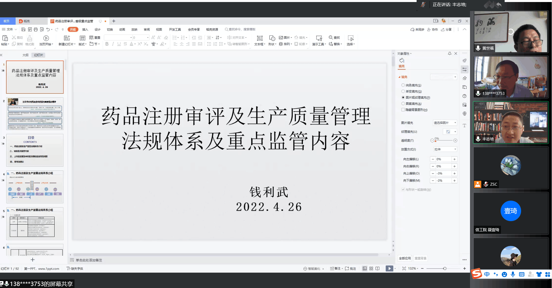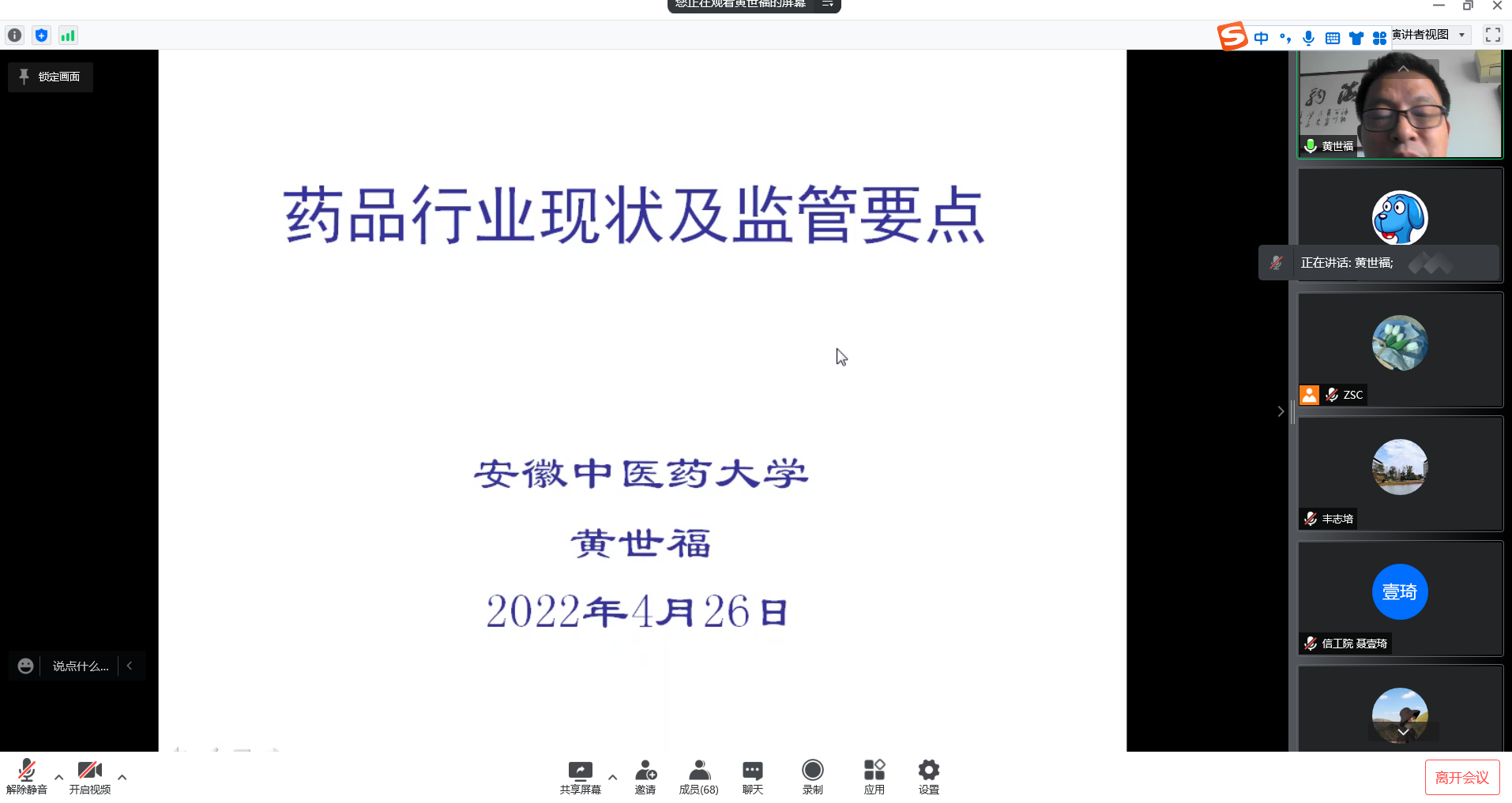 4月26日下午,公司举办2022年第一期“我与公共部门领导专家面对面”专题系列学术讲座,邀请安徽省药品审评查验中心副主任黄世福、安徽省药品审评查验中心副研究员钱利武分别担任主讲,讲座通过线上会议方式开展,由经理丰志培主持,副经理陶群山、公司教职工及公共管理学位点全体硕士研究生参加。