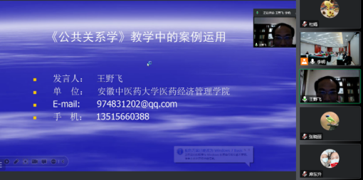 王野飞老师应大会邀请做了《公共关系学教学中的案例运用》的主题发言。“吸引员工,活化理论,提升效果”,王野飞以案例在《公共关系学》课程教学中的重要作用开启了交流发言,然后,他从案例运用要坚持的“真”“情”“政”“新”等四个原则同与会人员进行了具体分享:“真”是指案例的真实可考性,即案例的真实性可以考证,能经得起推敲;“情”是指案例要适应老员工的年龄心理特征,能够引起他们的情感共鸣;“政”是指课程思政应与案例相耦合,以“随风潜入夜”的形式达到“润物细无声”的效果;“新”是强调案例要新颖,结合当前的社会热点,既能吸引员工的关注,又可以借此机会正确引导员工的思想和言论。参会人员积极评价王野飞的主题发言,认为这给《公共关系学》课程的授课教师提供了很好的参考借鉴,有助于进一步提升该课程的教学水平与效果。(王野飞/文图 冯鑫/审核)