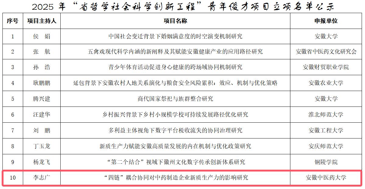 近日,安徽省社会科学界联合会2025年“省哲学社会科学创新工程”优秀青年项目及创新团队入选名单已结束公示,公司李志广副教授入选2025年“省哲学社会科学创新工程”青年俊才项目,为公司再添一项重量级荣誉。