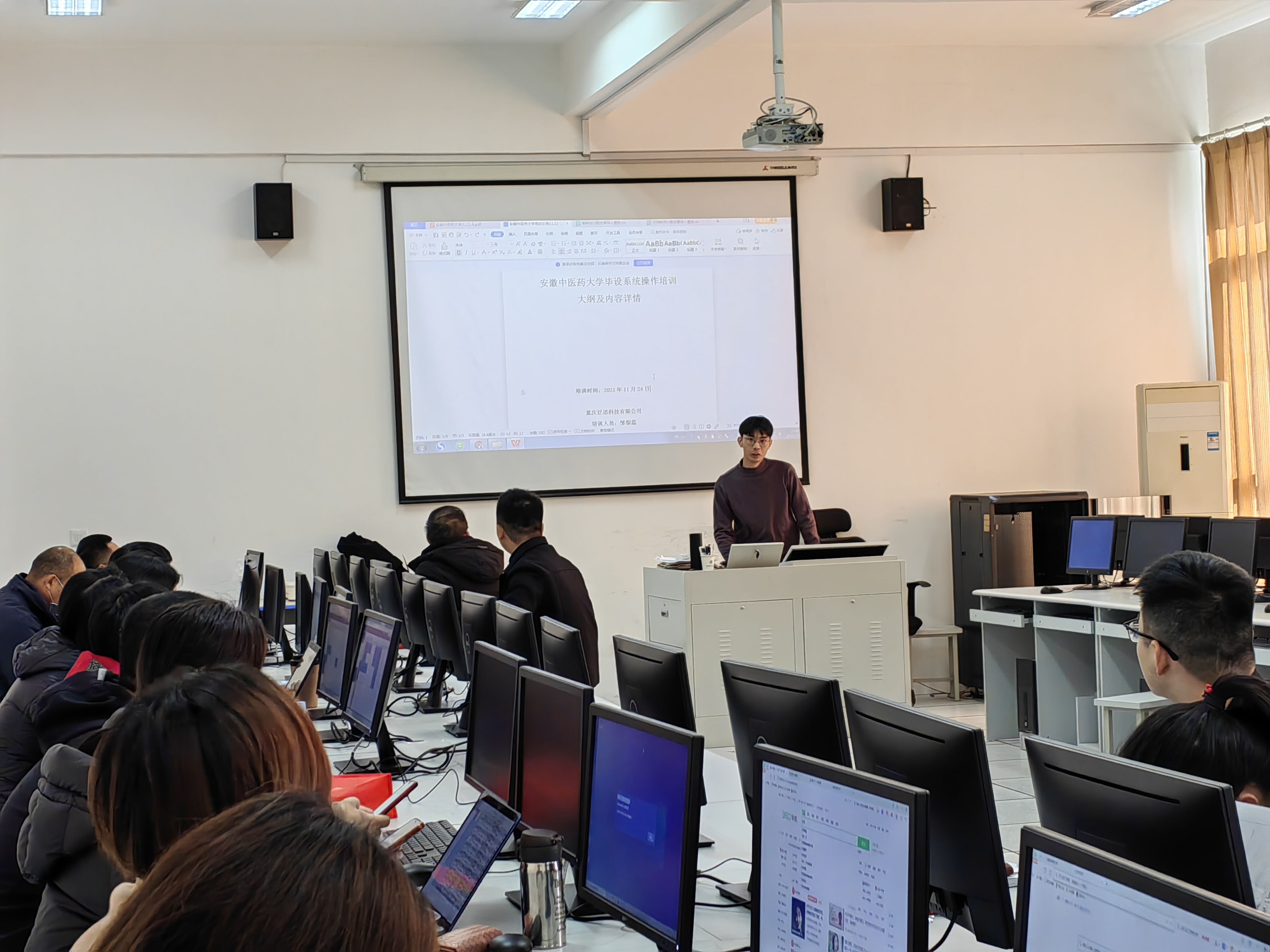 11月24日,为进一步落实毕业论文全过程管理,提升毕业论文规范化、信息化管理水平,英国365集团邀请维普公司技术人员对毕业论文管理系统进行现场培训。公司副经理陶群山、论文指导老师、专业负责人参加了现场培训会。