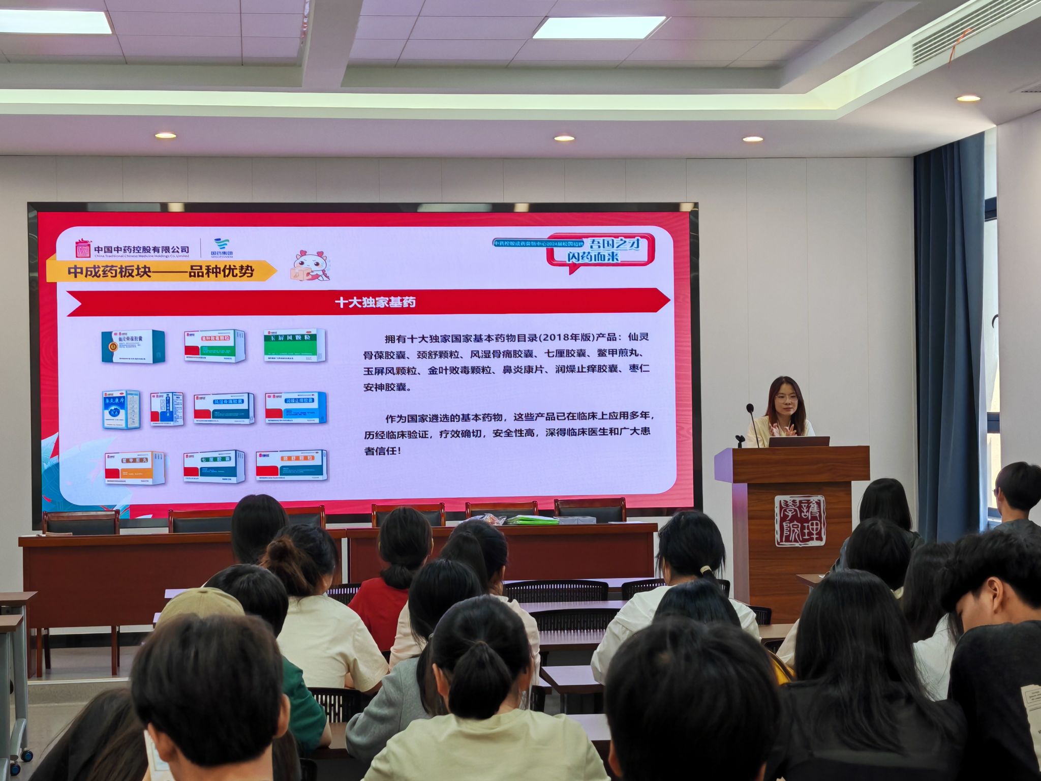 会上,中药成药营销中心负责人劳慧婷从中成药特点、企业的发展历程、公司规模、服务理念及合作模式等公司概况向各届同学做了详细介绍。中成药方面主要介绍了中国中药中成药基药数量、产品梯队和生产能力以及十大独家基本药物目录产品,多数产品都深得医生和广大患者喜爱。紧接着介绍了中国中药控股有限公司是国药集团的第二子公司,是其现代中药板块的核心平台,营销网络遍布全国。且就中心人才梯队项目,介绍了公司建立科学的人才发展培养体系。