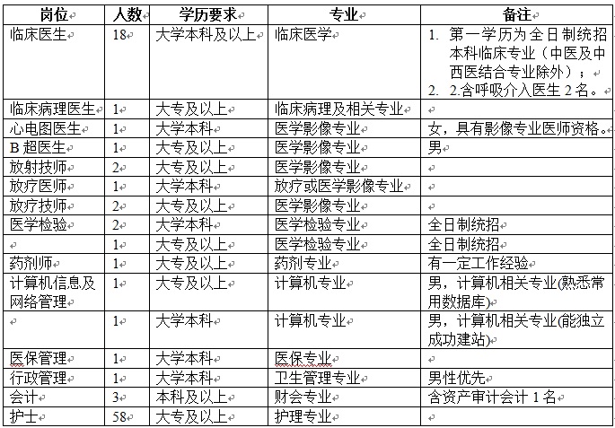 安徽省胸科医院是隶属于安徽省卫生厅的省级卫生事业单位,是我省唯一的集呼吸系疾病医疗、预防、科研、宣教和康复于一身的省级专科医院,是上海市肺科医院协作医院、安徽医科大学教学医院,是安徽省结核病防治研究所的临床治疗中心。 根据工作需要,经研究,2012年在编制以外公开向社会招聘应、历届大专院校毕业生95名(不含参加省人事厅统一考试的岗位)。 一、招聘原则 按照“公开、平等、竞争、择优”的原则,严格招聘工作纪律和工作程序,做到过程公开、结果公开、确保公平、公正。 二、招聘岗位及条件:(见下图) 三、报名及资格审查 1. 报名时间:2012年3月12日——3月22日(双休日照常接受报名)。 2. 报名地点:合肥市绩溪路397号安徽省胸科医院人事科(行政楼三楼)。 联系电话:0551-3615311, 电子邮箱:ahshfkyy@163.com 3. 报名提交材料:身份证、外语及计算机等级证原件和复印件; 一寸近期免冠照片3张;应届毕业生提交员工证、公司推荐信及实习单位证明原件和复印件;历届毕业生提交毕业证及学位证、执业资格证及注册证、聘任证书原件及复印件。 4. 应聘者填写《安徽省胸科医院公开招聘报名表》,经对报名者进行资格审查后,发放准考证。 四、考试及考核 1. 考试 ⑴ 考试方式:采用笔试和面试相结合的方式进行。考试成绩实行百分制,笔试成绩占60%,面试成绩占40%。 ⑵ 考试内容:笔试主要考查应聘岗位所需的专业基础理论和专业知识,以及运用专业理论知识分析、解决问题的能力。 笔试结束后,根据考试成绩从高分到低分,按1:3比例进入面试。 ⑶ 面试由专家委员会组织进行,主要了解考生的综合素质,包括仪表举止、逻辑思维能力、协调与应变能力、言语表达能力、研究与发展潜力、以及利用专业理论知识解决实际问题的能力。 ⑷ 笔试及面试时间待定。 笔试面试结束后依据总成绩排序按招聘岗位1:1的比例确定考核对象。 考试程序结束后将拟定的考核对象名单在安徽省胸(肺)科医院网站公布。 2. 考核 考核由省胸科医院组织考核人员采取实地调阅应聘人员档案、听取公司或工作单位意见等方式进行,主要考查被考核对象的政治思想、道德品质、业务素质、工作实绩及遵纪守法等情况。 五、体检及聘用 根据考试成绩及考核情况按招聘岗位1:1比例确定拟聘对象,并组织进行健康体检,体检项目及合格标准参照有关录用国家公务员体检的标准执行。 拟聘人选在安徽省胸(肺)科医院网站上公示一周。公示无异议的办理聘用手续。 六、其他事项 1. 应聘人员必须是国家统招的应、历届毕业生,若有作假,一旦发现即取消考试资格或解聘; 2. 应聘人员在考试中缺考,视为退出应聘;在组织考核阶段退出应聘程序,或体检不合格,公司将按考试成绩从高分到低分顺序递补本岗位其他应聘人员。 3. 按照省人事厅有关规定,新进的人员一律实行聘用制。 4. 本方案未尽事宜,由省胸科医院人事科负责解释。 联系电话:0551-3615311。
