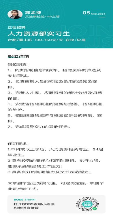 艾迪康招聘一名人事小伙伴,提供住宿,一周可实习3-5天。