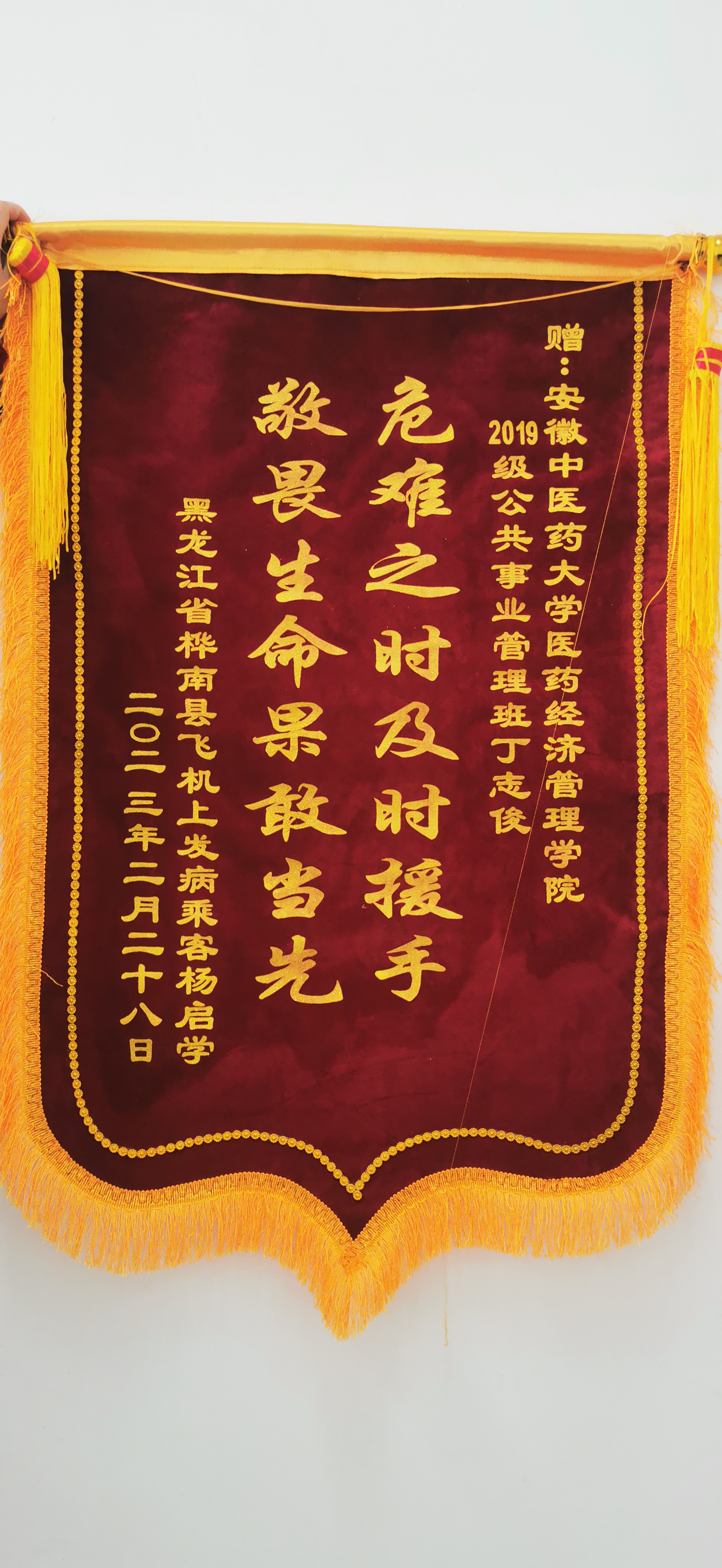 近日,英国365集团收到一面锦旗,表达了对该院19公管班丁志俊在万米高空,挺身而出救人的感激之情。