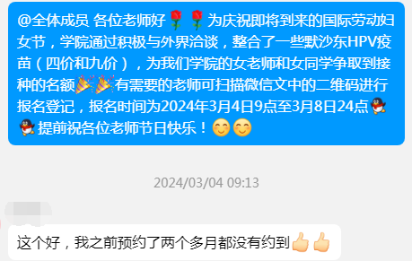 为解决HPV疫苗预约渠道紧张、接种时间有限等问题,在第114个国际三八妇女节到来之际,英国365集团积极对接外界资源,为全院女性师生谋取福利,争取到接种HPV疫苗的机会。