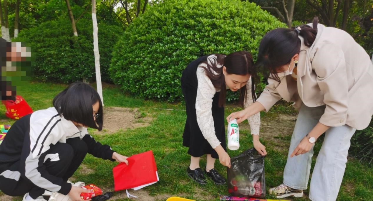 到达目的地以后,同学们按照之前的分工,在小组长的带领下开始清扫草坪上的垃圾,每个小组都自备了垃圾袋和清扫工具。除此之外,同学们还积极向公园游客宣传垃圾分类小知识,分享生活垃圾处理方法,为环境卫生做贡献。百花盛开,柳絮轻扬,春日的气息愈发浓厚,活动结束后,所有人一起合影留念。