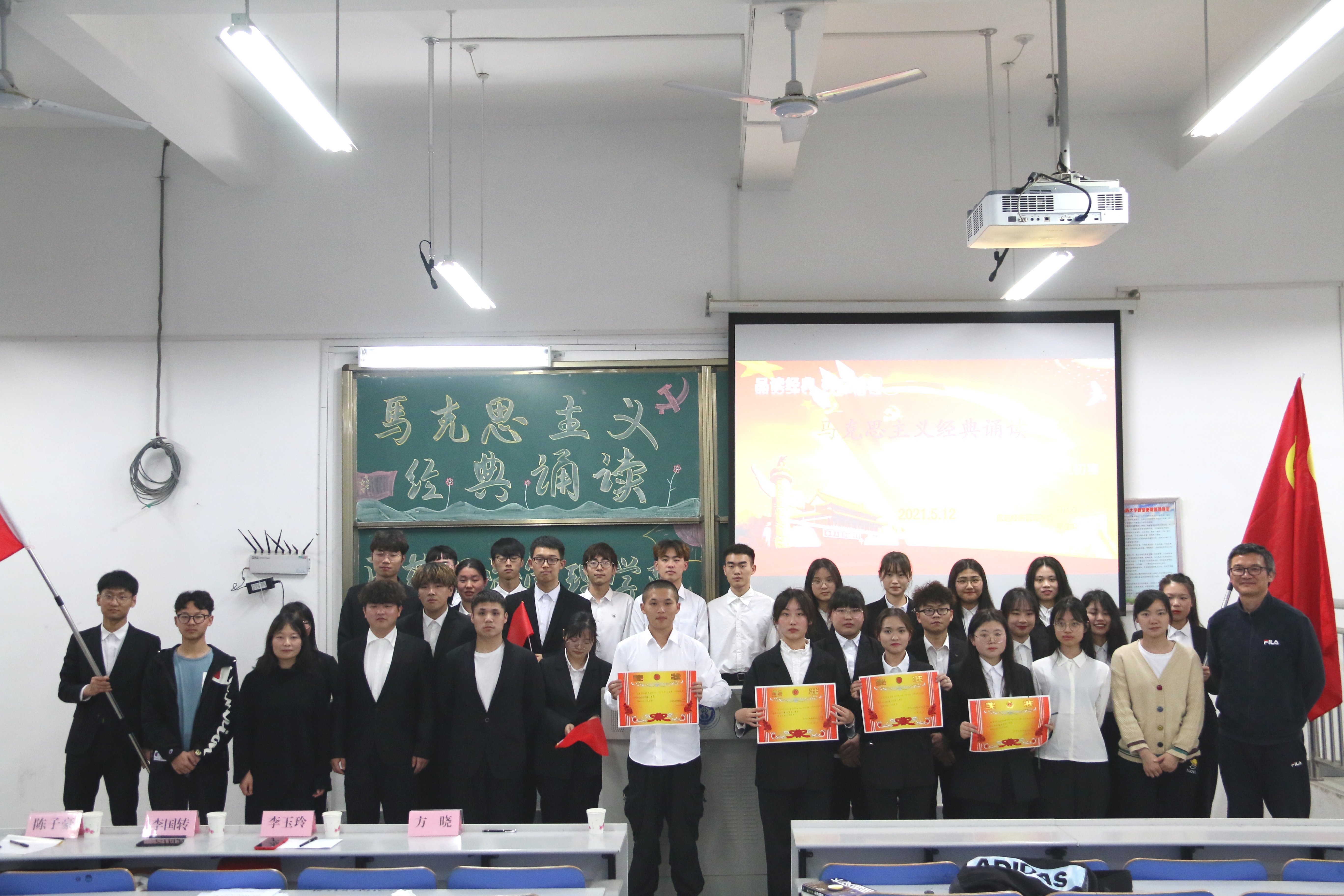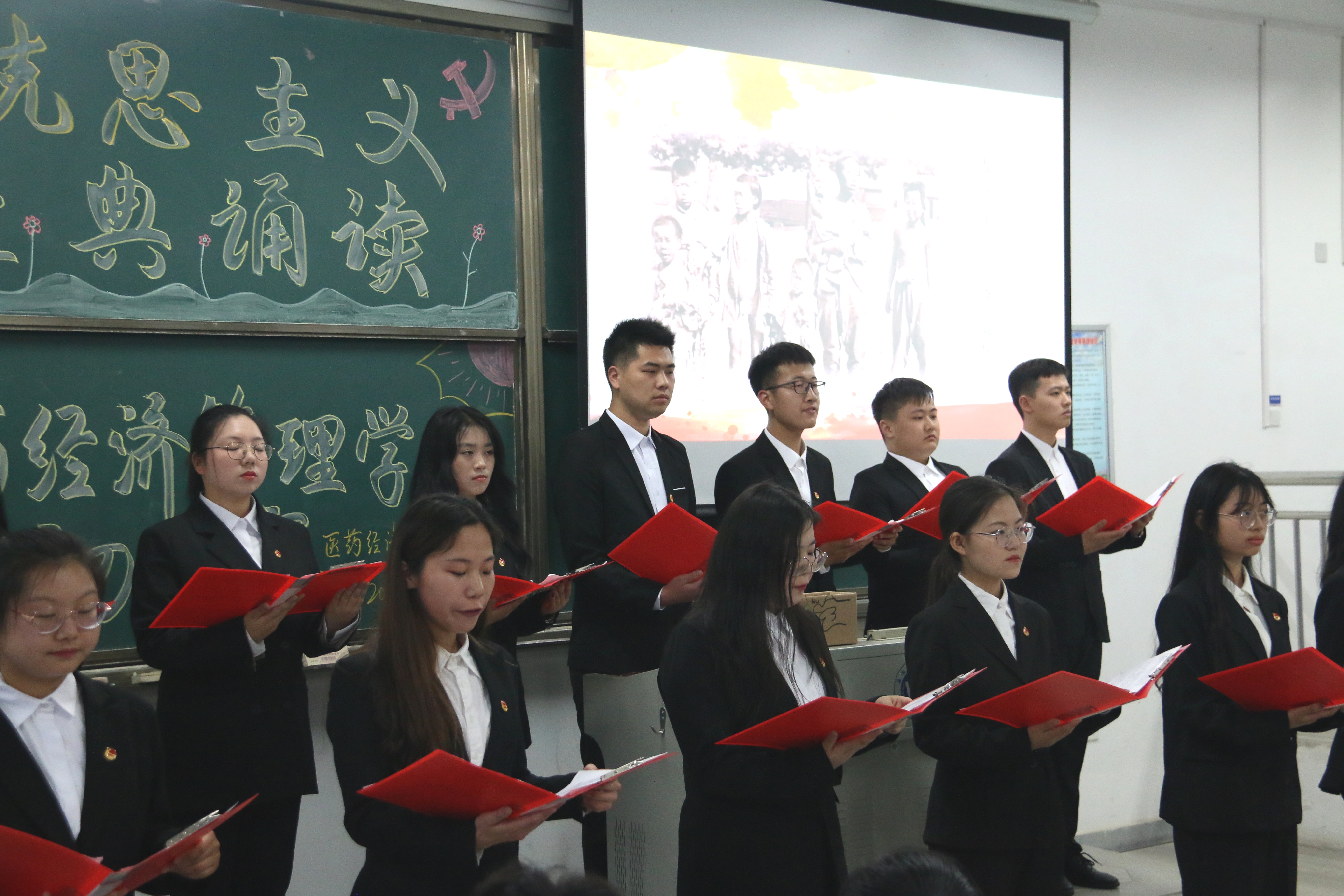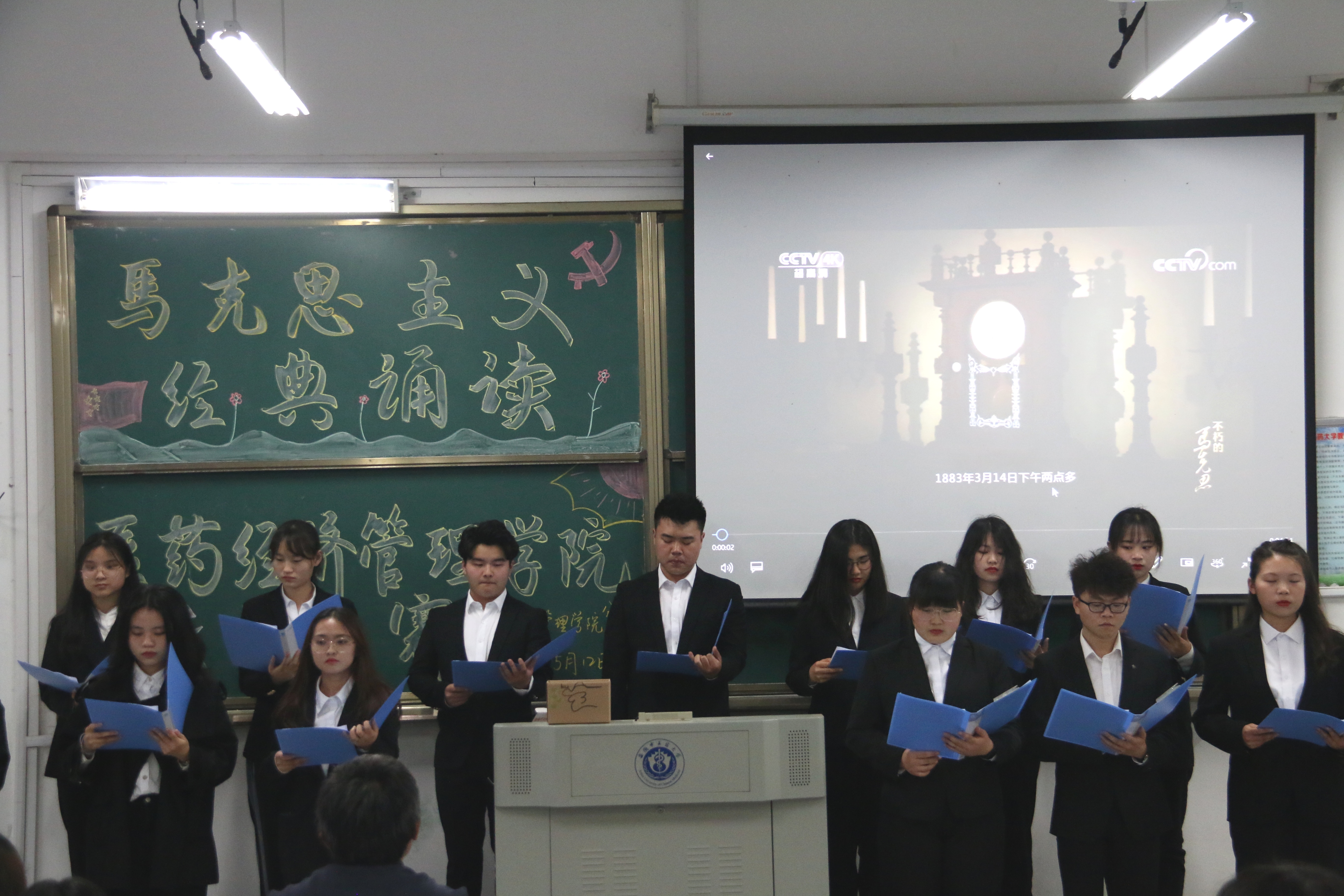首先上场的是人管二班,他们朗诵的是《在庆祝中国共产党90周年大会上的讲话》,让我们了解了近代以来中国人民和中华民族不懈奋斗的光荣历史和伟大历程。随后国贸二班和人管一班分别带来朗诵作品《在马克思墓前的讲话》,为马克思一生为无产阶级事业所作的伟大贡献作出了了赞颂。紧接的是公管班、国贸一班和国贸三班带来的《共产党宣言》,《宣言》用鲜明透彻的语言阐述了一个新的世界观,为认识人类社会发展提供了科学的方法论,为无产阶级革命提供了行动指南。最后一个上场的来自保险班的《六月革命》,法国六月革命起义虽然失败了,但它将永垂史册,为后人所敬仰!